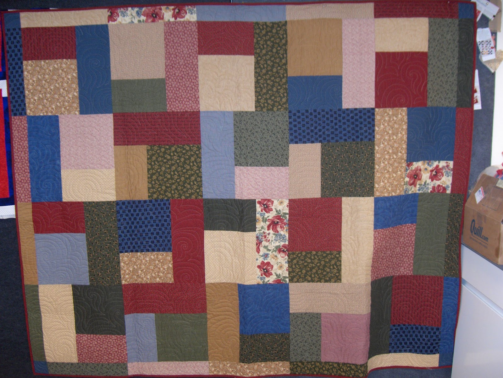 My niece Corey got married in October. This is a Strip Twist quilt from Bonnie Hunter's web page Quiltville. Even though the blocks appear to be "on point" they are not. I asked Corey what color she likes, and she said "brown" so here it is. A zillion different fabrics. It is a king.